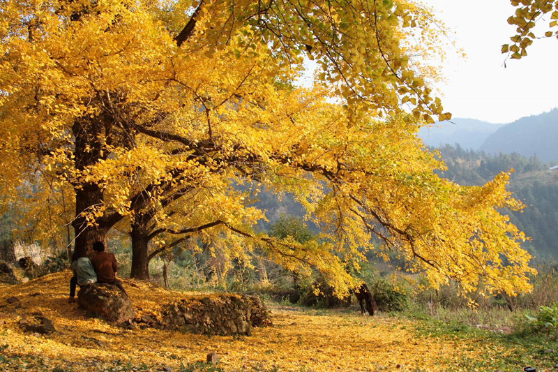 广西海洋之乡天下银杏第一乡——广西灵川县海洋乡。每年的秋天,灵川县海洋乡的100多万棵银杏树的叶子会变得金黄, 把海洋乡装点成童话世界一般。灵川县海洋乡素有“银杏第一乡”的美誉,有银杏树100多万棵,其中百年以上的野生银杏树就有17000多棵。微风轻拂,落叶缤纷,树上树下黄灿灿的一 片,让人仿佛进入了一个美丽的童话世界。
